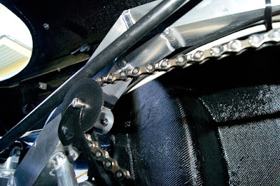 - Yllä olevassa kuvassa keskivaiheilla pyöreässä alumiinisessa ketjunjännittäjän akselinpidikkeessä näkyy mutteri, joka lukitsee sisällään olevan kuusikolopultin (kuusikolo näkyy paremmin yllä olevaa edeltävässä kuvassa) paikalleen.